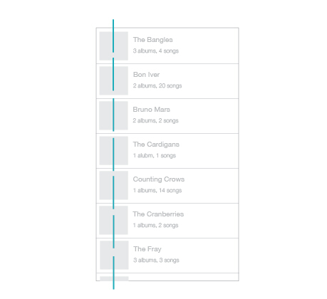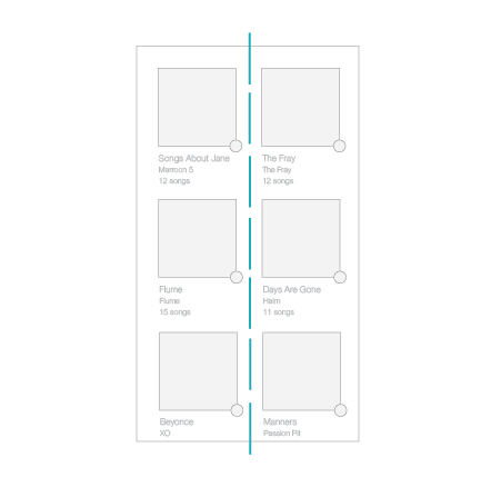 軸最常見(jiàn)于對(duì)稱元素的使用,當(dāng)元素被布置成軸對(duì)稱的布局的時(shí)候,會(huì)給人有序感。就像生活中絕大多數(shù)的事情一樣,我們更傾向于享受有序的的東西,它們令人感覺(jué)平穩(wěn)、舒適、平易近人。最簡(jiǎn)單的一個(gè)例子就是iTunes 程序中的專輯列表的設(shè)計(jì),所有的專輯列表在界面的左側(cè)保持對(duì)齊,圍繞虛線軸軸對(duì)稱。