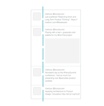 從產(chǎn)品設(shè)計(jì)的角度上來(lái)看,Twitter 的時(shí)間線設(shè)計(jì)就是一個(gè)很好的案例,左側(cè)的頭像和右側(cè)的推文共同塑造出縫隙中軸線的感覺(jué)。