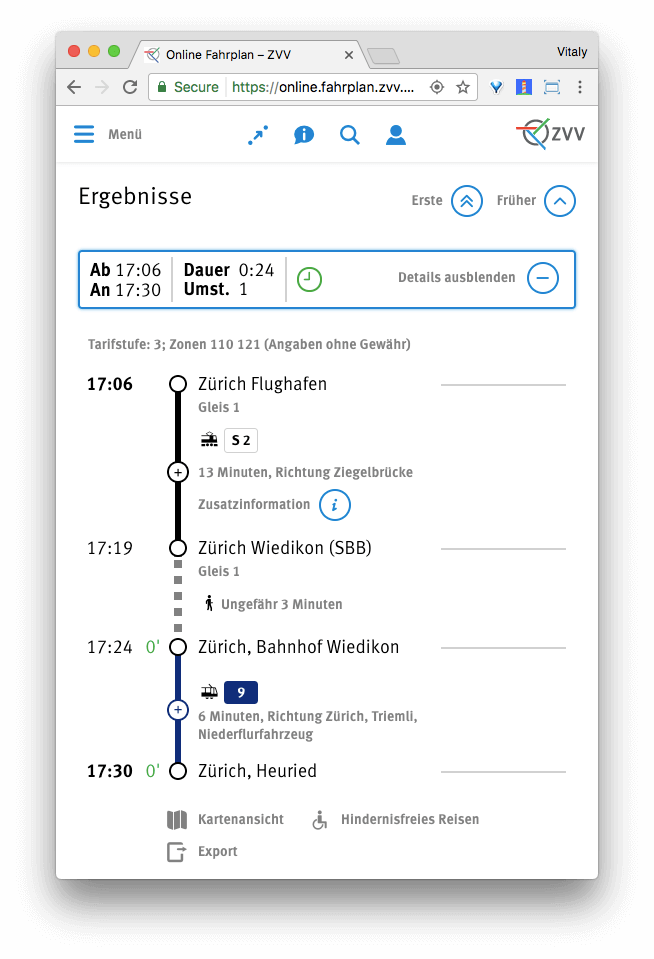 Zvv.ch是結(jié)合了兩個(gè)具有相同圖標(biāo)的折疊面板(帶圓圈的加號(hào))——一個(gè)是指示行程的選項(xiàng),一個(gè)表示在兩個(gè)位置間的停頓。兩者都有同樣的目的(展開),看起來相似。他們清楚地傳達(dá)了圖標(biāo)的目的和預(yù)期的行為。