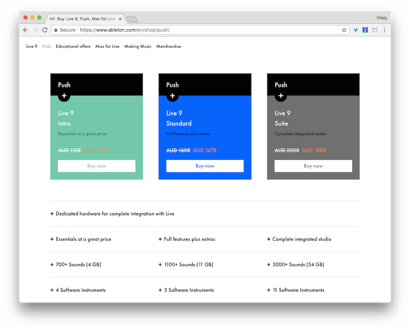 Ableton.com使用帶加號(hào)的圖標(biāo)表示捆綁交易(上圖)和展開(如果你向下滾動(dòng)頁面)。在這里使用具有多重含義的圖標(biāo)可能會(huì)有點(diǎn)混亂,因?yàn)橛行┯脩艨赡軙?huì)希望在點(diǎn)擊頂部的圖標(biāo)時(shí)進(jìn)行展開(并且不會(huì)發(fā)生任何事情),在點(diǎn)擊底部的帶加號(hào)圖標(biāo)時(shí)沒有任何的交互(展開)。(View large version)