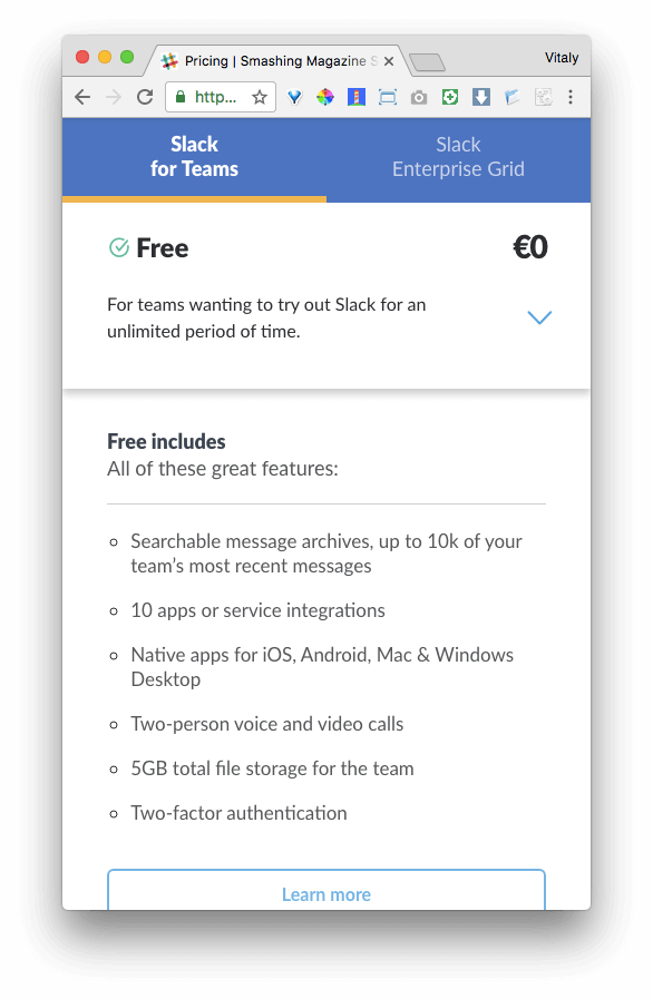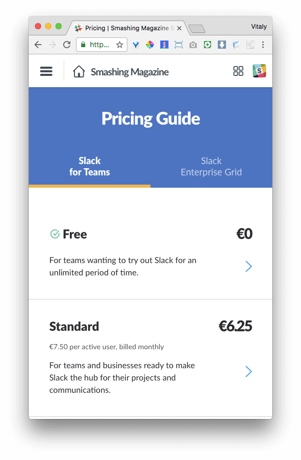 在Slack上,定價(jià)計(jì)劃在手機(jī)上顯示為收縮的折疊面板,V行圖指向右側(cè),而移動(dòng)則是從上到下。