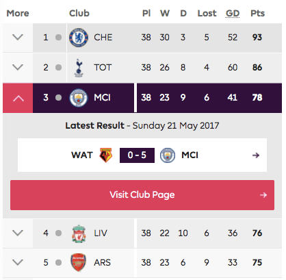 折疊面板不一定只用于導(dǎo)航。它也可以顯示或多或少的細(xì)節(jié)。例如,在PremierLeague.com中的的表格或排行榜表單。(Desktop view Mobile view)