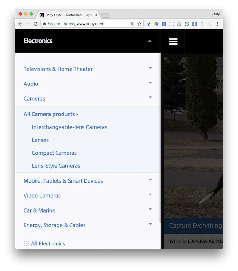 在Sony.com中,如果展開了一個(gè)部分,用戶點(diǎn)擊了另一個(gè)部分,則展開部分會(huì)自動(dòng)折疊。這種行為在網(wǎng)站之間是不一致的,所以用戶不能依賴也不期望這種行為無所不在。Large view.