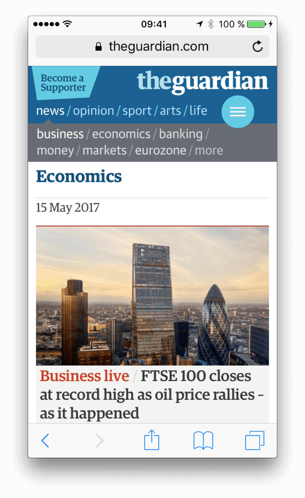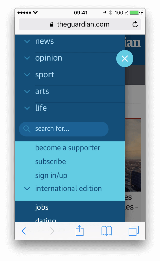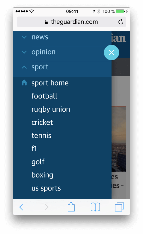 在The Guardian網(wǎng)站上,一個(gè)V字形放在左邊,其次是分類標(biāo)題和空格。整欄觸發(fā)展開,分類主頁作為折疊面板項(xiàng)目中的第一個(gè)選項(xiàng)整齊地展示出來。