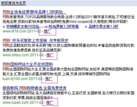 然后到百度搜下“網(wǎng)購”這關鍵詞,如圖,首頁前9項都被做“推廣”的占據(jù)了,然后接在下面的也都被大站占據(jù)了,這類極熱門的關鍵詞,如果沒有雄厚的資金,很難排名到首頁的,建議不要選擇!
