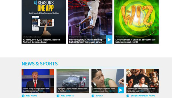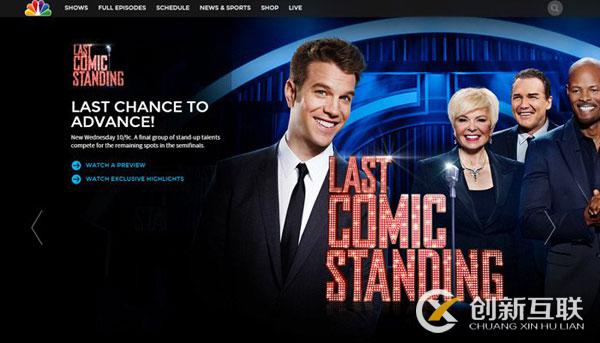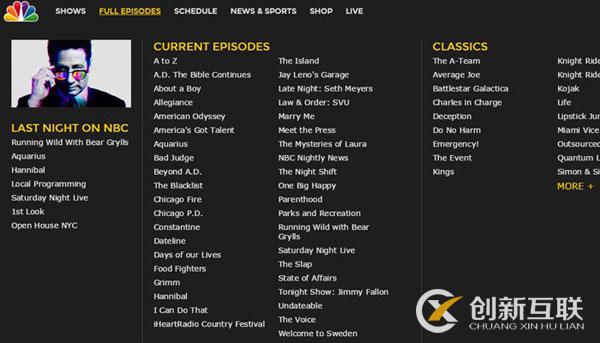 一些主要的導(dǎo)航鏈接包括滑動(dòng)下拉子菜單。例如,如果你點(diǎn)擊“顯示”會(huì)給你一長(zhǎng)串的菜單和即將到來(lái)的節(jié)目。主要的菜單決定你在尋找什么,然后深入到細(xì)節(jié)。“全集”提供了一個(gè)非常類似的下拉但鏈接出去的全流集NBC節(jié)目。