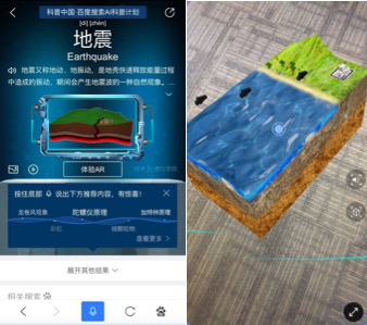 現(xiàn)在就可以拿起手機,在手機百度中嘗試輸入 “地震”。和設想的列表展示結(jié)果不同,用戶可以看到一個生動活潑的頁面。在這個展示窗口里,有地震的語音播報介紹,也有更加生動的AR交互體驗,更有用3D的方式直觀認知地震的形成原理,讓用戶感受地震時的地殼變化。