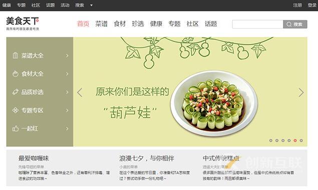 “美食天下”網(wǎng)站上有著口味豐富的菜譜,如果只是依次呈獻(xiàn)給網(wǎng)站訪客的話很不利于訪客搜尋到自己想要瀏覽的內(nèi)容,用戶體驗(yàn)甚是不佳。對此,“美食天下”將自己的菜譜分別設(shè)立了“新秀菜譜”、“一周熱門”和“最受歡迎的家常菜”三個類別,讓網(wǎng)站訪客得以根據(jù)自己的興趣愛好來準(zhǔn)確地找到自己想看的信息。