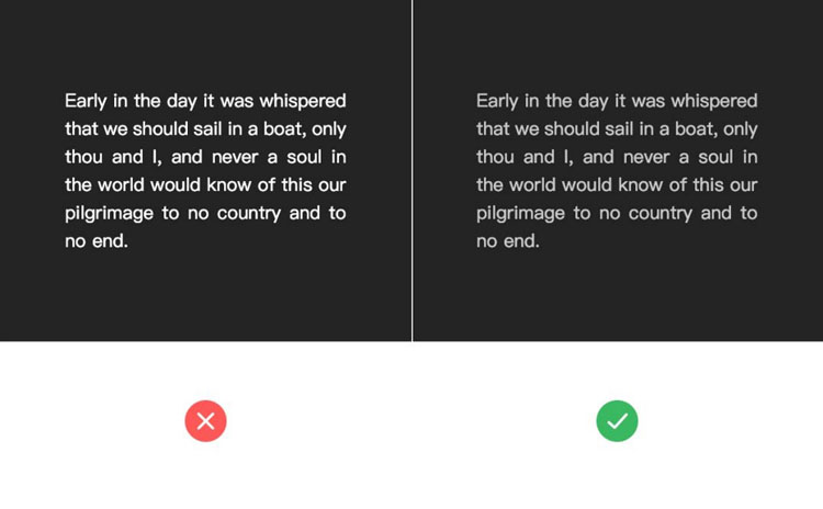 在深色界面下,文字顏色盡量不要使用純白。對(duì)于黑底白字的形式,白色文字更加容易吸睛,視覺刺激更加強(qiáng)烈,但強(qiáng)烈的同時(shí)會(huì)帶來視覺疲勞,造成不適的閱讀體驗(yàn),甚至極端情況下的對(duì)比會(huì)使白色產(chǎn)生眩光,不利于文字的識(shí)別。
