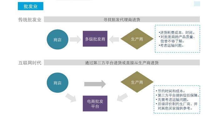 2、在互聯(lián)網(wǎng)繁榮到一定程度后,中間代理批發(fā)商的角色會(huì)逐漸消失,更多直接是B2C的取代。