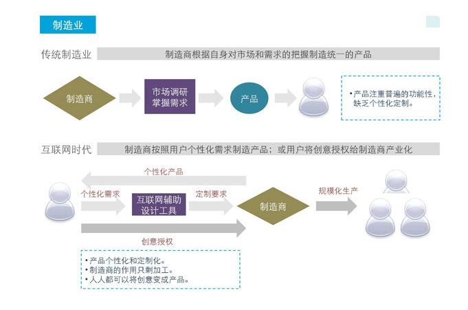 傳統(tǒng)的制造業(yè)都是封閉式生產(chǎn),由生產(chǎn)商決定生產(chǎn)何種商品。生產(chǎn)者與消費(fèi)者的角色是割裂的。但是在未來,互聯(lián)網(wǎng)會(huì)瓦解這種狀態(tài),未來將會(huì)由顧客全程參 與到生產(chǎn)環(huán)節(jié)當(dāng)中,有用戶共同決策來制造他們想要的產(chǎn)品。也就是說,未來時(shí)代消費(fèi)者與生產(chǎn)者的界限會(huì)模糊起來,而同時(shí)傳統(tǒng)的經(jīng)濟(jì)理論面臨崩潰。這也是注定 要誕生的C2B全新模式。