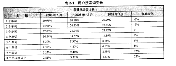 據(jù)著名市場調(diào)研公司Hitwise2009年2月的研究,用戶實(shí)際使用的搜索詞有越來越長的趨勢,如表3-1所示是2008年1月到2009年1月用戶搜索關(guān)鍵詞長度變化趨勢 。