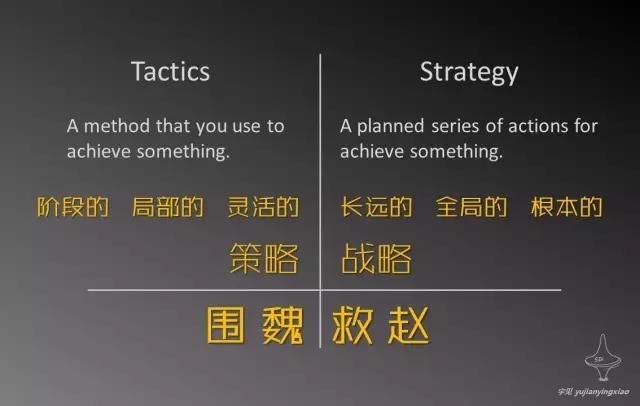 要探討這一點(diǎn),先讓我們來(lái)看看這兩個(gè)概念的常規(guī)解釋。在英文中,有關(guān)“戰(zhàn)略”(Strategy)一詞的解釋是——A planned series of actions for achieve something. 稱戰(zhàn)略是為了達(dá)到某一目標(biāo)而進(jìn)行的一系列行動(dòng)規(guī)劃;而有關(guān)“策略”(Tactic)的解釋是——A method that you use to achieve something.稱策略是為達(dá)到某個(gè)目標(biāo)而使用的方式方法。