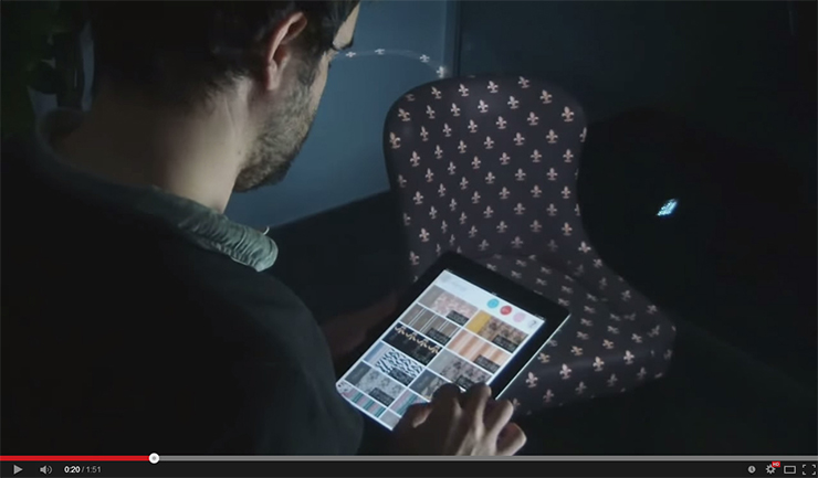 手機(jī)操作使攝影儀將影像投射到家居陳列品上 通過3D投影技術(shù)以及Microsoft的Kinect裝置,家具零售商可以將各種家具材質(zhì)及款式的數(shù)據(jù)存儲(chǔ)于云端數(shù)據(jù)庫上,然后通過相配的APP應(yīng)用程序,就可以讓你根據(jù)喜好選擇不同的材質(zhì)及款式,然后攝影儀就會(huì)將影像投射到家居陳列品上。