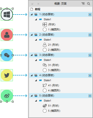 將五個(gè)轉(zhuǎn)為動(dòng)態(tài)面板的圖標(biāo)(1,2,3,4,5)按照從上到下的的順序重疊排放在一起,即1放在最上面,2~5的順序可以隨意排列。排列好后就是下面這個(gè)樣子。