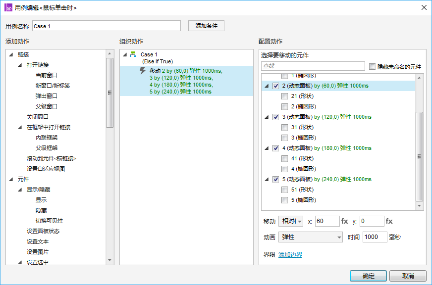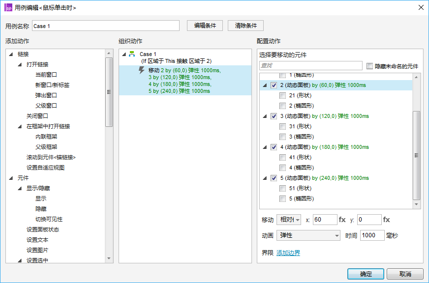 點(diǎn)擊主菜單彈出二級(jí)菜單的效果其實(shí)就是利用了“移動(dòng)”動(dòng)作,當(dāng)點(diǎn)擊主菜單時(shí),移動(dòng)二級(jí)菜單2,3,4,5;另外分別設(shè)置移動(dòng)的相對(duì)位置,已保證彈出后的二級(jí)菜單是可以均勻排列的,為了使彈出帶有動(dòng)效,可以設(shè)置移動(dòng)動(dòng)作的動(dòng)畫效果(彈性)和時(shí)間(1000ms)。