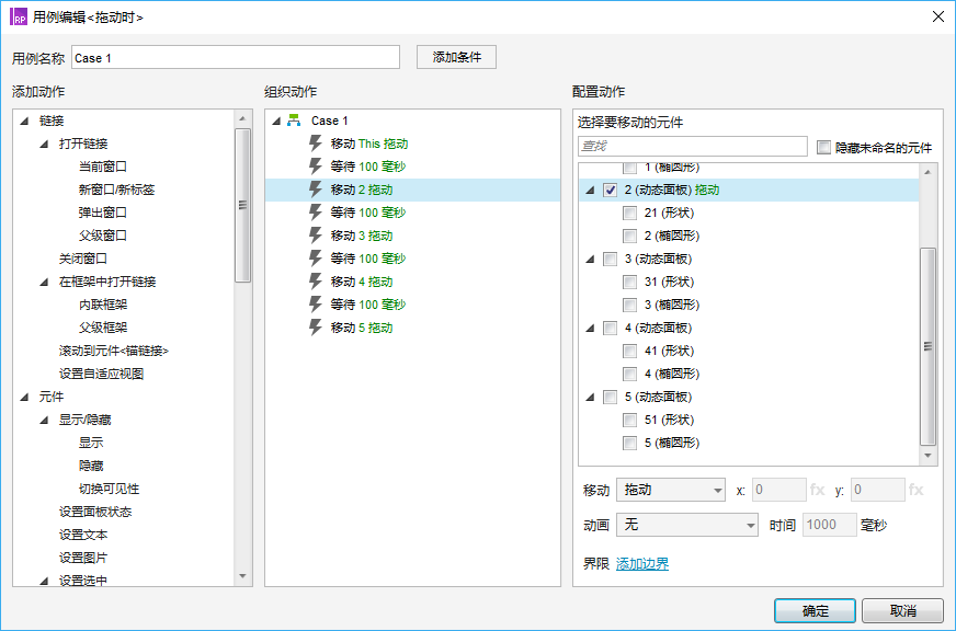 為主菜單圖標(biāo)的動(dòng)態(tài)面板增加拖動(dòng)事件,執(zhí)行的動(dòng)作就是跟隨拖動(dòng)軌跡來(lái)移動(dòng)五個(gè)菜單圖標(biāo),但為了可以出現(xiàn)拖動(dòng)軌跡效果,在執(zhí)行移動(dòng)二級(jí)菜單2,3,4,5動(dòng)作之間增加等待時(shí)間。