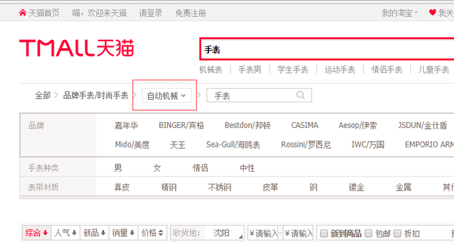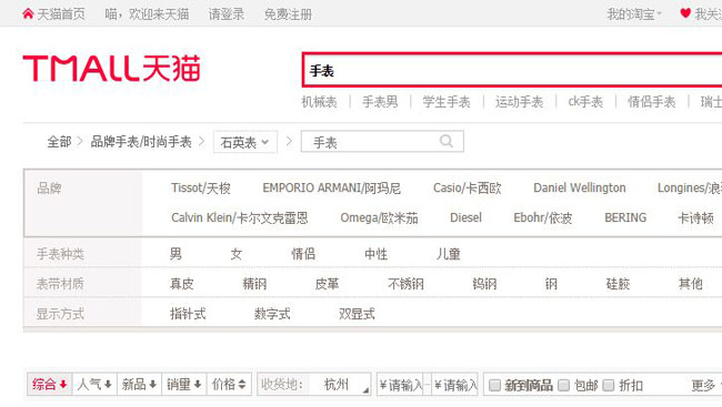 首先,小編想買一只手表,所以去天貓上去搜索了手表,然后朋友告知我石英表時(shí)間比較準(zhǔn),所以選擇了石英表,一級(jí)一級(jí)的點(diǎn)擊肯定很費(fèi)勁,所以天貓用了篩選功能,這樣亦可以控制網(wǎng)站的層級(jí),接下來(lái)通過(guò)一通的賽選,看了很多手表