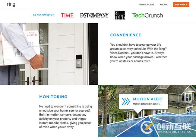Ring是一款門鈴產(chǎn)品,不在互聯(lián)網(wǎng)圈子內(nèi)。其內(nèi)置的攝像頭可以讓你通過手機看到門前來者,甚至還能檢測到自己房屋周邊的動作情況并向你發(fā)送警報。這是個比較新奇的理念,所以可能需要詳加解釋一番,其登陸頁面充分而優(yōu)雅地展示出了產(chǎn)品的所有好處。