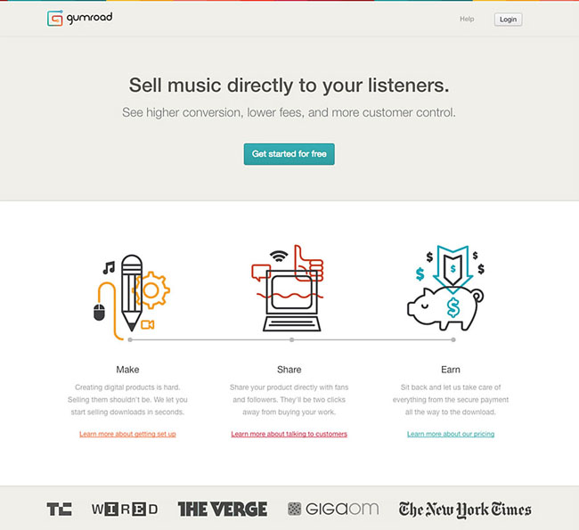 Gumroad可提供網(wǎng)上銷售服務,用戶還可通過其系統(tǒng)收款。其登陸頁面踩中了很多設(shè)計好實踐方式:有明確的方向指引(大大的“免費設(shè)立”按鈕)、用詞巧妙的操作引導、與之合作的大網(wǎng)站的logo,還有用精美插畫繪制的整體流程方式。