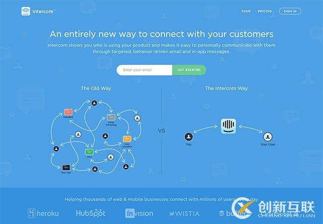 Intercom服務可幫助用戶提高向客戶發(fā)送電子郵件的效率。其登陸頁采用了相對比較復雜的理念以便大家理解產(chǎn)品工作原理以及好處所在。這個設(shè)計中我最喜歡的是對比展示舊有工作方式和Intercome的簡便方法。