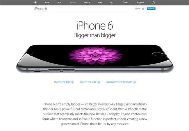 iPhone 6的登陸頁面采用了其標志性地營銷風格——大量留白、巨型方便閱讀的文字和高質(zhì)量的圖片襯托白色背景。不僅如此,公司還加入了相對比較微妙的動畫效果——向下滾動鼠標時,手機會以視差的形式自己移動。這一切元素共同組成了一套漂亮、容易領(lǐng)會而且具有蘋果風格特色的登陸頁。