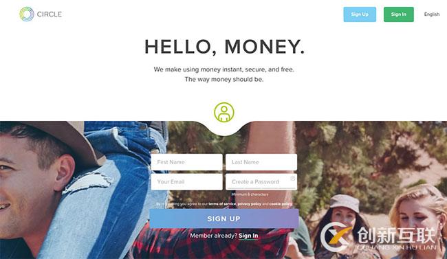 Circle是一項比較新穎的服務,其可輔助你使用比特幣買東西。公司登陸頁面有幾個方面做得非常好,比如在多個位置放置注冊表單,而不是單獨跳出頁面。另外,其還采用了幾個其他設(shè)計訣竅。鼠標滾動時,其背景圖片上采用了比較聰明的視差效果,但大型的圖片并不會原地不動,而是會縮小到遠景,營造出不同尋常的運動感。