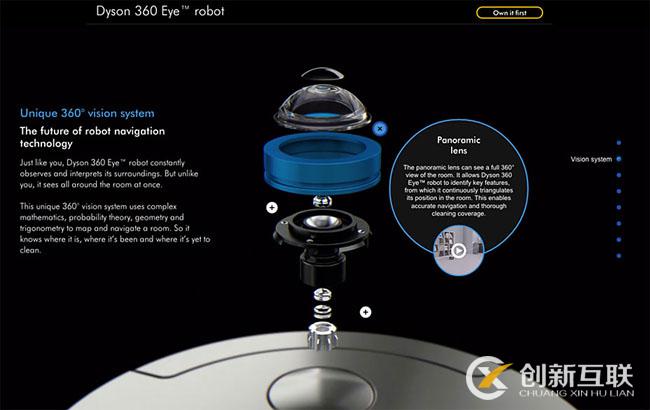 Dyson正式揭開了其機器人吸塵器Dyson 360 Eye的面紗。其登陸頁面采用絕妙而不同尋常的方式展現(xiàn)了其不同尋常的產(chǎn)品。頁面在顯眼位置展示了成品,鼠標滾動采用了有趣的動畫效果展示每個零部件,以便用戶仔細查看吸塵器內(nèi)部構(gòu)造。而最后就組成了這一信息滿滿而又十分有趣的產(chǎn)品展示登陸頁面。