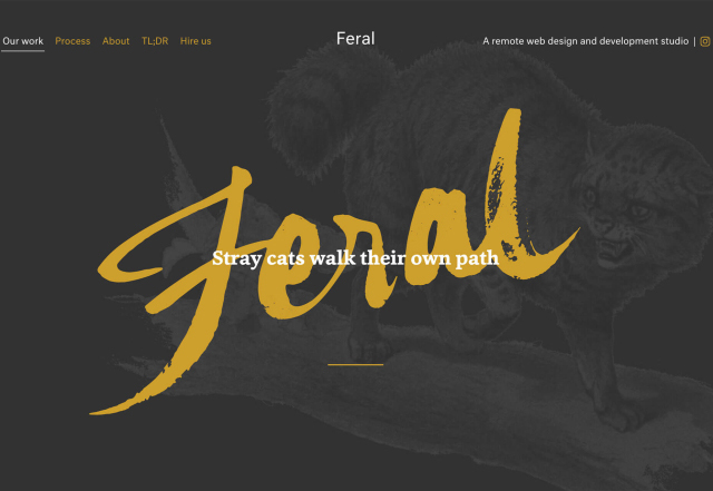Feral的名字也以手寫字體出現(xiàn)在屏幕中央,但亮黃色的字母出現(xiàn)在一張黑色圖片的頂部,后面是公司的簡單標(biāo)語。其余的設(shè)計是更明亮和最小,但暗示的時髦字體通過驚人的細(xì)節(jié)。