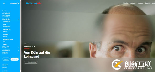 德國(guó)網(wǎng)站Medien?stadt.koeln對(duì)垂直導(dǎo)航有不同的看法。他們的導(dǎo)航始終隱藏在漢堡包菜單之后,但仍然跨越屏幕的整個(gè)高度。