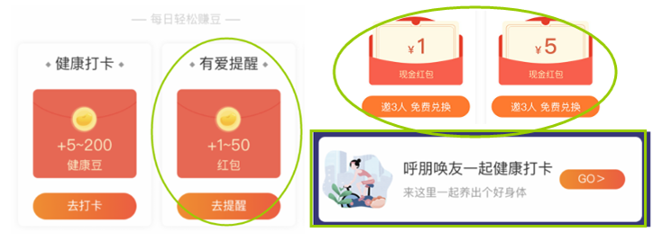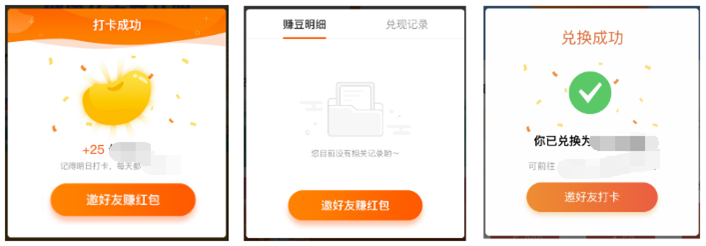 多處尾部分享露出:在不影響體驗(yàn)前提下,盡量在每個(gè)分支流程設(shè)置尾部分享按鈕,讓用戶大限度去分享。比如:在用戶簽到完會(huì)設(shè)置邀請banner,在賺豆攻略頁/打卡明細(xì)頁/邀請記錄頁/提現(xiàn)頁等都可以加分享邀請按鈕。