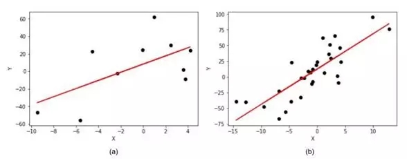 我們模擬了一個(gè)線性回歸模型,其斜率(b)=5,截距(a)=10。從圖6(a)(數(shù)據(jù)量小)到圖6(b)(數(shù)據(jù)量大),我們建立了一個(gè)衰退模型,此時(shí)我們可以清楚地看到斜率和截距之間的區(qū)別。在圖6(a)中,模型的斜率為4.65,截距為8.2,而圖6(b)中模型的斜率為5.1,截距為10.2相比,可以明顯看出,圖6(b)更接近真實(shí)值。