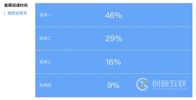 對(duì)比下圖會(huì)發(fā)現(xiàn),在搜索結(jié)果頁用戶對(duì)滾頁更沒耐心一些,將近一半(46%)的時(shí)間都花費(fèi)在了第一區(qū)塊,前兩個(gè)區(qū)塊的總占比達(dá)到3/4(75%)。