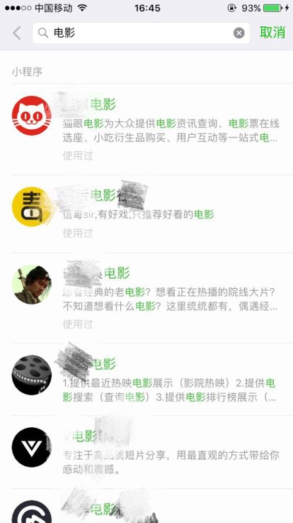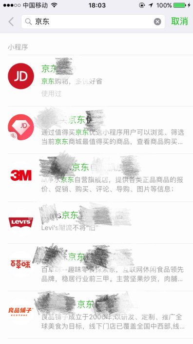 但如果完全開放小程序模糊搜索的功能,用戶就可能會搜索出很多功能不精準的小程序。在這種情況下,用戶就需要花一點時間對搜索結(jié)果進行篩選,那就和公眾號內(nèi)容搜索沒什么區(qū)別了。如果用戶在搜索小程序時用了太多時間,就不符合小程序即用即走的定位了。