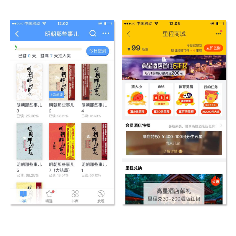 其實(shí)手勢(shì)相同的功能在不同的產(chǎn)品中會(huì)有不同的展示形式。以簽到功能為例,閱讀類應(yīng)用一般來(lái)說(shuō)功能結(jié)構(gòu)比較簡(jiǎn)單,作為行為召喚元素的簽到按鈕在這里可以做的稍微寫(xiě)實(shí)一點(diǎn)來(lái)凸顯出來(lái)。但是在功能比較多且結(jié)構(gòu)復(fù)雜的產(chǎn)品中這樣做就不太現(xiàn)實(shí)了,飛豬的簽到頁(yè)面有太多的內(nèi)容,有太多需要展示的信息。如果這里的簽到按鈕使用了陰影,高光的樣式來(lái)進(jìn)行凸顯,那么考慮到設(shè)計(jì)的一致性其他地方的按鈕是否也要用相同的樣式?那么整個(gè)頁(yè)面就會(huì)顯得特別亂。