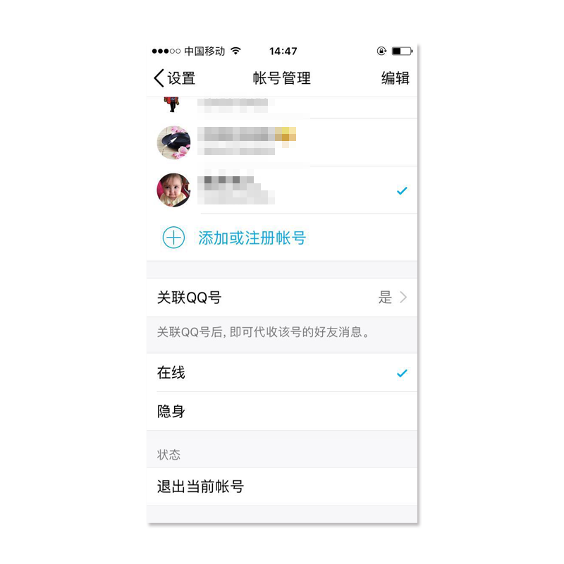 同樣的道理,在同是鵝廠旗下的QQ中“添加或者注冊(cè)賬號(hào)”我表示歡迎,退出當(dāng)前賬號(hào)你就慢慢找吧。