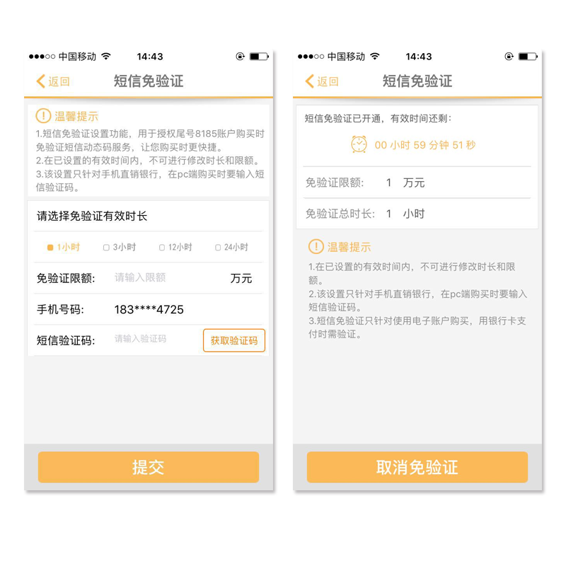 接下來(lái)再說(shuō)一個(gè)反面例子,一些用戶為了在理財(cái)時(shí)簡(jiǎn)化操作流程會(huì)選擇開(kāi)通短信免驗(yàn)證功能,這樣子就不用購(gòu)買(mǎi)一次理財(cái)就要輸入一次短信驗(yàn)證碼。開(kāi)通成功的結(jié)果頁(yè)面中“取消免驗(yàn)證”按鈕沒(méi)有進(jìn)行弱化,一些心急的用戶可能以為是“返回”按鈕就點(diǎn)擊了下去。這樣又要重新驗(yàn)證一次了。