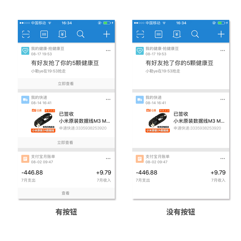 例如:支付寶中我的快遞,月賬單,我的健康等這些模塊的下方都有立即查看的“按鈕”。其實(shí)這些“按鈕”沒(méi)有多大的實(shí)際操作意義,因?yàn)橛脩舨挥梅且c(diǎn)擊到那個(gè)按鈕,只要點(diǎn)擊到了這個(gè)模塊的任何區(qū)域都可以完成跳轉(zhuǎn)。這里的“按鈕”是作為一種行為召喚元素來(lái)吸引用戶注意力,告訴用戶這個(gè)是可以點(diǎn)擊的。