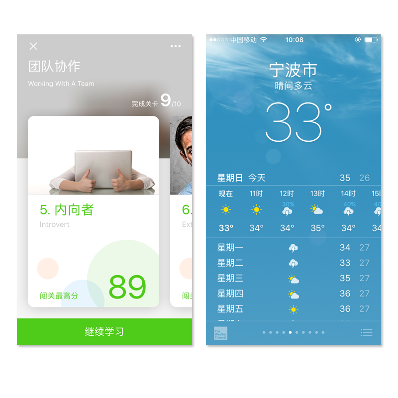 二是對(duì)于隱藏內(nèi)容的部分展示,這屬于給用戶提供了一個(gè)暗示,表明了操作的可能性。往右邊滑動(dòng)或許能看到更多的信息。例如天氣應(yīng)用中對(duì)于15時(shí)的天氣狀態(tài)展示了一點(diǎn),讓用戶了解滑動(dòng)可以看到更多的信息。