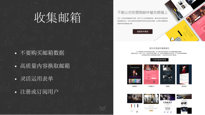 郵箱地址的收集,很大程度上關(guān)系到最終的效果。這里有幾個(gè)建議,不要購(gòu)買數(shù)據(jù),我們應(yīng)該通過高質(zhì)量?jī)?nèi)容讓用戶交出郵箱,靈活運(yùn)用表單,如果業(yè)務(wù)已經(jīng)有了用戶的積累,注冊(cè)或訂閱留下的郵箱都是很好的數(shù)據(jù)來源。
