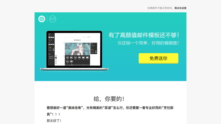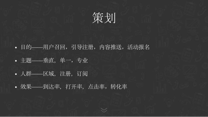 舉個(gè)例子,這是我們真實(shí)的案例,郵件的標(biāo)題是,有了高顏值郵件模版還不夠!你還缺一個(gè)簡(jiǎn)單,好用的編輯器。》》下面二張圖是郵件模版的式樣,分別配有二個(gè)按鈕,引導(dǎo)用戶點(diǎn)擊使用郵件模版,實(shí)際上,用戶點(diǎn)擊后,是需要注冊(cè)才能使用的。》》就很容易理解策劃的內(nèi)容。目的是引導(dǎo)注冊(cè),主題~郵件模版免費(fèi)用,發(fā)送的對(duì)象是通過表單收集來的精準(zhǔn)用戶,制定的目標(biāo)~注冊(cè)率7%,也就是100個(gè)人有7個(gè)人注冊(cè)。明確了這幾項(xiàng)才算第一步任務(wù)的完成。