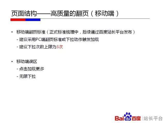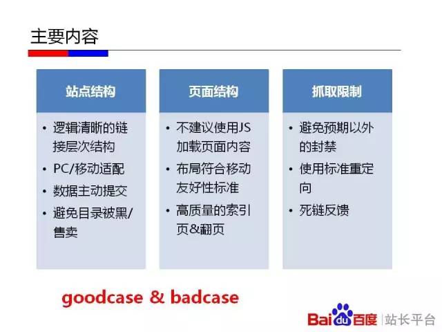 據(jù)百度官方表示,翻頁、索引、死鏈等都會影響到BaiduSpider對網(wǎng)頁的評價。那么,在百度Spider 2.0升級至3.0后,我們該如何建設(shè)對BaiduSpider友好的站點呢?針對這個問題,百度官方發(fā)布了一組PPT,分別從站點結(jié)構(gòu)、頁面結(jié)構(gòu)、以及抓取限制等方面講述了友好站點的“建設(shè)法則”。