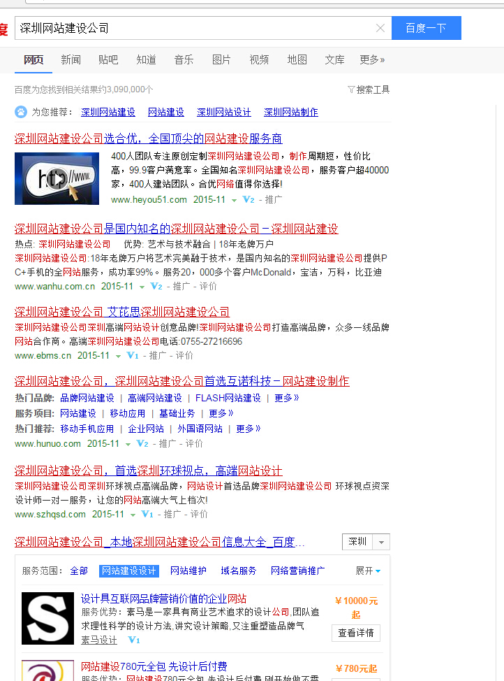 1、競爭激烈。在百度中搜索“深圳風(fēng)站建設(shè)公司”相關(guān)的數(shù)據(jù)就達(dá)到300萬條,而搜索首頁前半屏的左右都被百度推廣的廣告位占據(jù),可見競爭的激烈程度。在這樣的市場競爭下,廣告費(fèi)用也大幅提高。