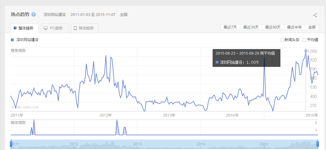 通過相關(guān)指數(shù)我們可以看到從2011年至2015年的行業(yè)搜索指數(shù)來看,深圳網(wǎng)站建設(shè)行業(yè)在2013、2014年趨勢有所下滑,從2015年開始逐步上升,說明市場需求有所加大,追其原因應(yīng)該有以下幾點(diǎn):其一就是隨著經(jīng)濟(jì)的發(fā)展,不斷涌現(xiàn)出新的公司,尤其是這兩年提倡自我創(chuàng)業(yè)的市場呼聲非常高,以致新公司和新隊(duì)伍不斷出現(xiàn),市場容量也隨之加大。其二就是國家倡導(dǎo)的“互聯(lián)網(wǎng)+”思維逐漸深入人心,傳統(tǒng)企業(yè)也在尋求互聯(lián)網(wǎng)產(chǎn)業(yè)鏈的突破,所以在風(fēng)站建設(shè)這一塊也加大了投入力度。其三,經(jīng)歷了2012年的網(wǎng)站建設(shè)高潮后,很多網(wǎng)站也到了改版更新的時(shí)候,很多企業(yè)也希望網(wǎng)站建設(shè)能跟上企業(yè)發(fā)展的步伐,此前很多