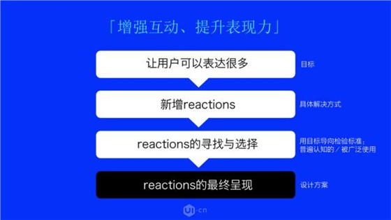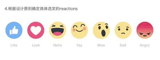 他是這么闡述LIKE的設計方案的:這個設計的目的是優(yōu)化LIKE的按鈕,增強用戶的互動意愿,以及提升LIKE的表現(xiàn)力。而他做的第一件事情就是理解什么叫增強互動,什么叫表現(xiàn)力,背后的產(chǎn)品目標是什么?是用戶可以更多的表達。然后開始找如何讓這個目標具體化。接下來尋找什么是被普通認知和廣泛接受的reactions。它通過各種途徑去找用戶最常用的表情是什么,最常搜索的表情是什么,最多的短評論是什么。設計師們希望可以從側(cè)面尋找大家在表達過程中喜歡用什么reaction,然后找到他,并通過之前定義號的原則進行篩選,完成設計方案。