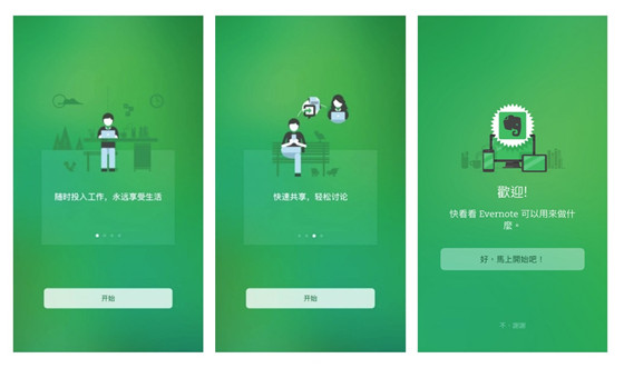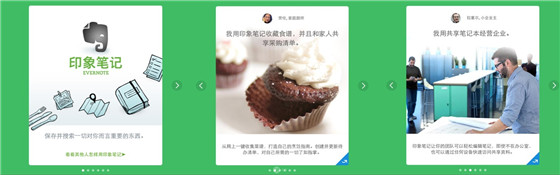 還有印象筆記各端引導頁的處理,同樣是針對不同的使用場景和用戶的習慣,采用不同元素,來特殊處理。像Web和Mac端,一般較長停留時間,因此會采用一些結(jié)合場景的真實圖片,詮釋功能特色,讓用戶更全面的了解產(chǎn)品能為他們做什么;而移動端,以碎片化場景為主,因此采用的是簡潔插畫處理,干凈利索,利于get到重點。統(tǒng)一的部分,只是它們的綠色。