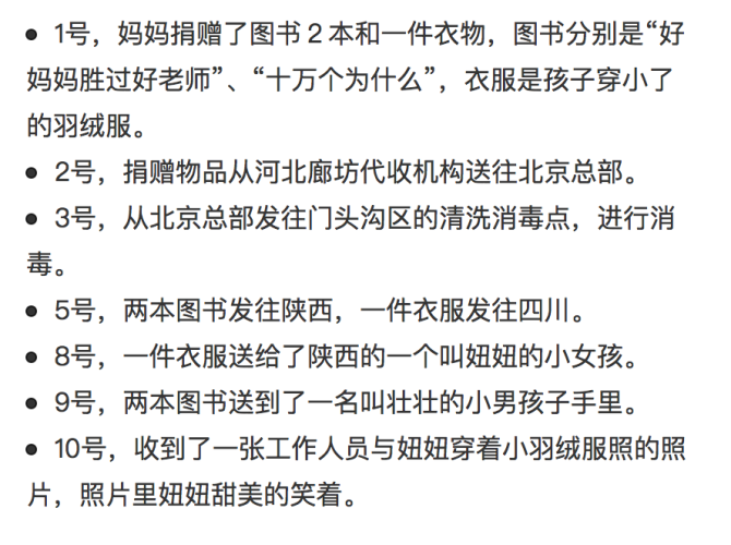 如下圖,這是我之前看到的一篇文章中描述的一段,事情是愛心媽媽捐贈了自己大孩子用過的物品,對于捐贈者來講,最擔心的是捐贈品一旦出手,就好像人間蒸發(fā)了一樣,那么這個時候,如果你能看到捐贈品每一個環(huán)節(jié)的流通,看到被捐贈者和贈品的互動,你是不是感覺很暖心。減少捐贈者的擔憂,也讓產(chǎn)品更加感性。