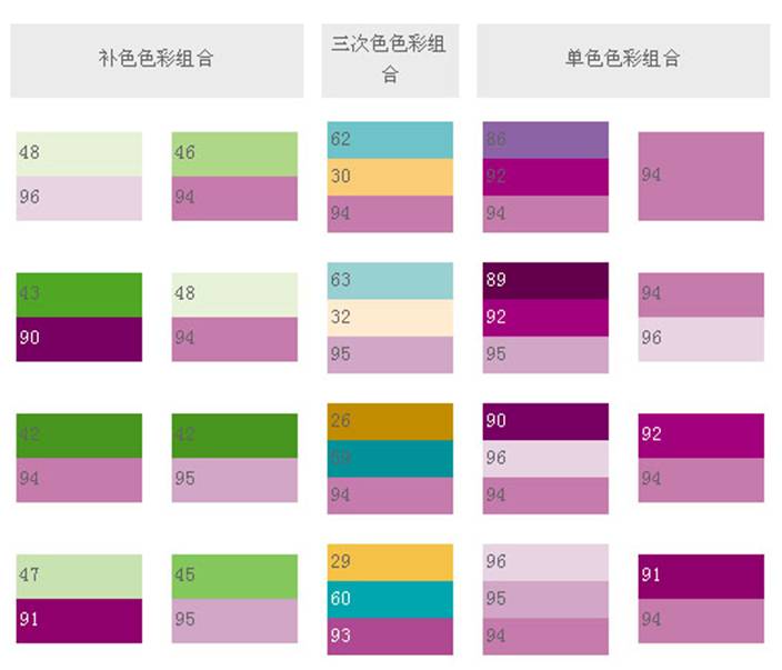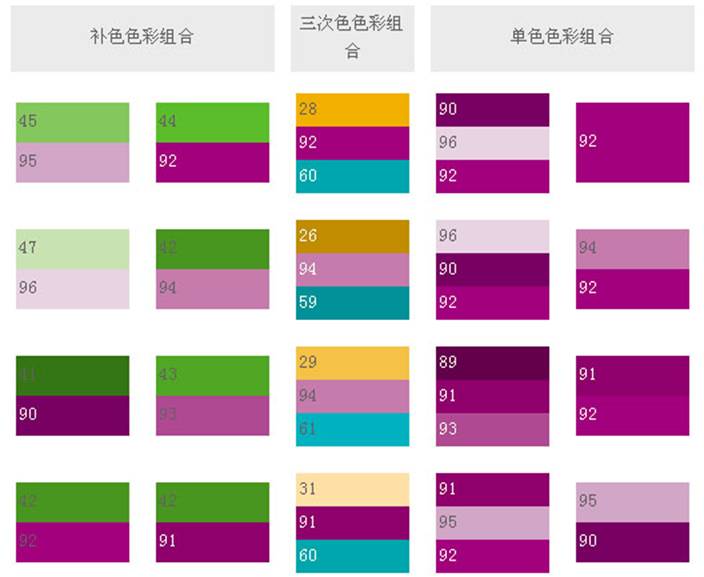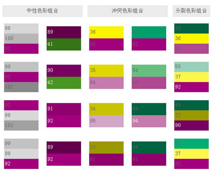較不好的色彩是紅紫色加黃色,或紅紫色加綠色,這兩種色彩也許暫時(shí)給人振奮的感覺,但其實(shí)已削弱了整體的效果。唯有黃綠色融合加上紅紫色,才是充分展現(xiàn)熱力、活力與精神的色彩。