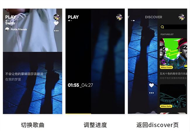 去除這個(gè)虛擬的“唱片”給我們帶來不僅僅是視覺上的輕量感,更意味著易用性上提升。用戶在moo音樂中切換歌曲、調(diào)整播放進(jìn)度、返回上一級(jí)頁面等都可以通過滑動(dòng)手勢(shì)來完成。并且它是幾款音樂產(chǎn)品中,唯一一個(gè)支持上下滑動(dòng)切換歌曲的,網(wǎng)易云音樂是左右滑動(dòng)切換歌曲,而qq音樂直接不支持,用戶必須點(diǎn)擊才能切換歌曲。我在之前的文章用戶體驗(yàn)之點(diǎn)擊和滑動(dòng)也提到過,滑動(dòng)手勢(shì)比點(diǎn)擊更容易受到用戶的青睞。