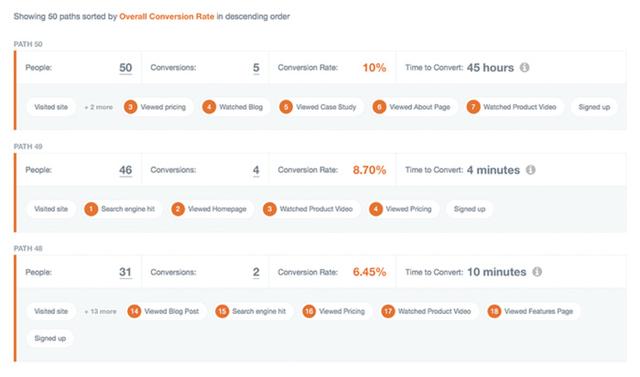 路徑報告可顯示訪問者的轉(zhuǎn)化路徑,用戶訪問頻道的方式(搜索引擎查詢,直接鍵入網(wǎng)址等),用戶采取的操作,以及每個路徑的轉(zhuǎn)化率以及轉(zhuǎn)化所花費的時間。這些數(shù)據(jù)讓開發(fā)人員更容易修正路徑,并可能為企業(yè)帶來直接收益。